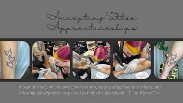 Join our Minnesota-based tattoo training and apprenticeship programs for body art and permanent makeup mastery. To book contact me at 612-263-2447 or email me at contact@fleurknowstattoo.com with what dates work for you.